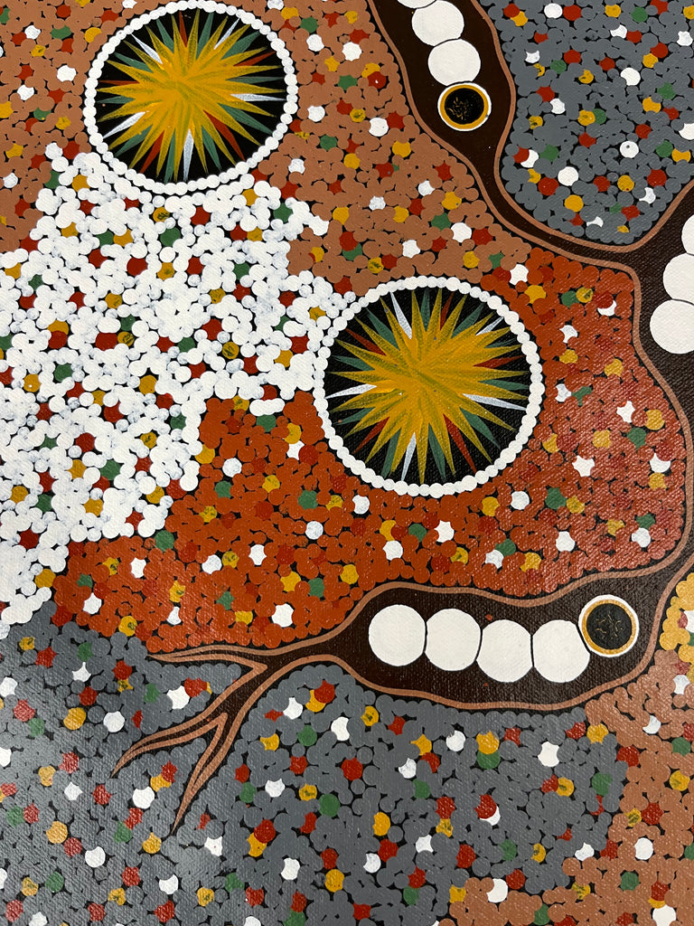 Jonathan was taught and influenced by his mother and his uncles, highly respected Papunya Tula artists, Paddy Carroll Tjungurrayi, and Two Bob Tjungurrayi.