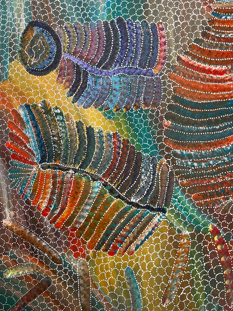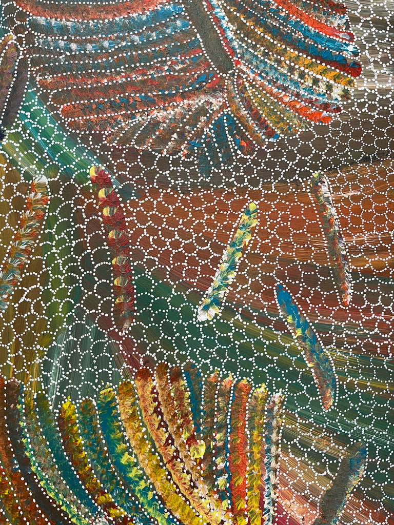 Her work often centres on the Dreaming story of "Kame" (Yam) a sacred narrative passed down through her Father's lineage. This dreaming is one of Utopia's most significant cultural stories and was also shared by the late Emily Kame Kngwarreye, one of Australia's most celebrated Aboriginal artists. The pencil yam is both a vital food source and a traditional healing plant for the Anmatyerre people and it holds deep spiritual importance.
