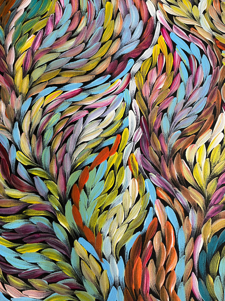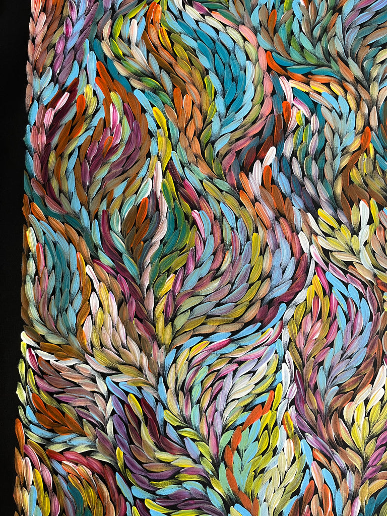 Rosemary Pitjara (Petyarre) was born in 1961 at Atneltyey (Boundary Bore) in the expansive Utopia homelands region of Central Australia, north-east of Mparntwe (Alice Springs). Rosemary is niece to the acclaimed artist Emily Kame Kngwarreye (dec.). Rosemary hails from both a region and family group of great artistic significance; a member of the famous Petyarre artist family; her cousin is the celebrated Gloria Petyarre (dec.) Many members of the Petyarre family are highly acclaimed painters in the Aboriginal art world.