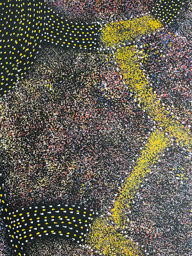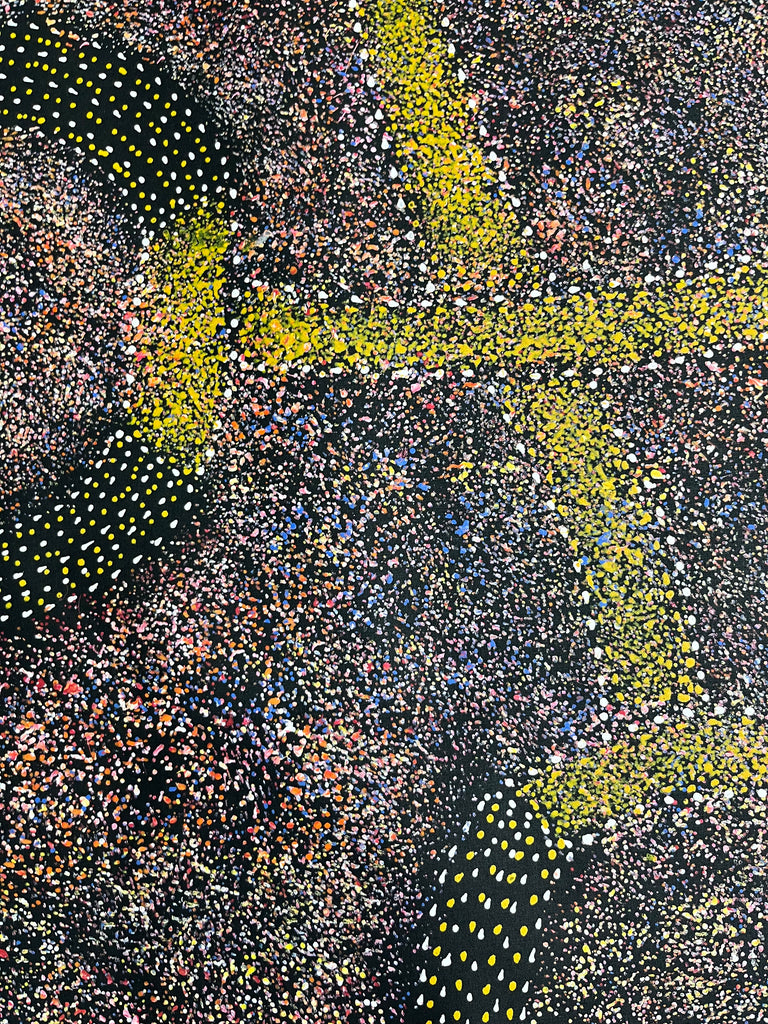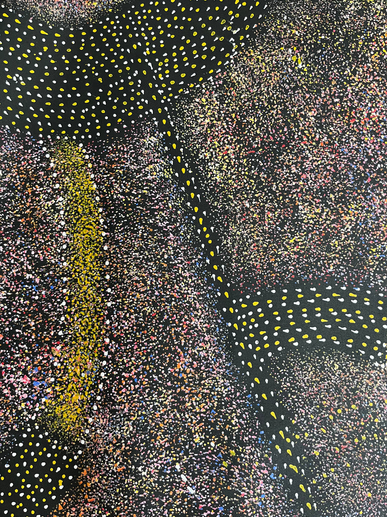 Roseanne learned the art of painting from her mother and paints the Bush Plum story with intricate dot techniques that evoke a vivid sense of the landscape. Her paintings represent the ripening stages of the bush plum, with dots that create a three-dimensional effect, almost bringing the fruit to life on the canvas. The diagonal lines that run through her work trace the paths walked by the women who gather the plums, meeting at the centre to share in the nourishment and spirit of the fruit. These paintings not only tell the story of the plant but also connect to the songs, ceremonies, and traditions that honour it.