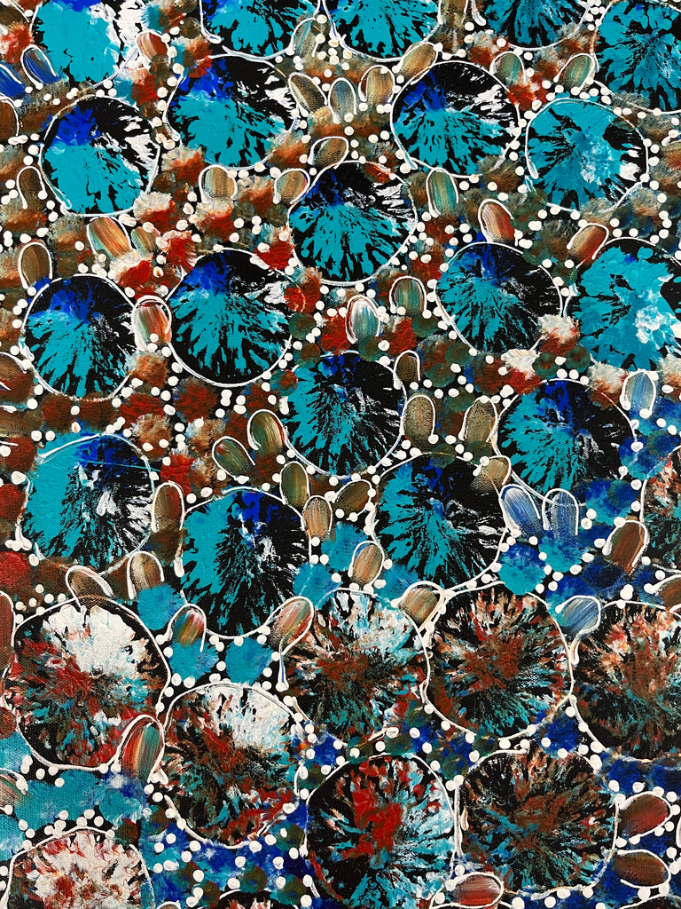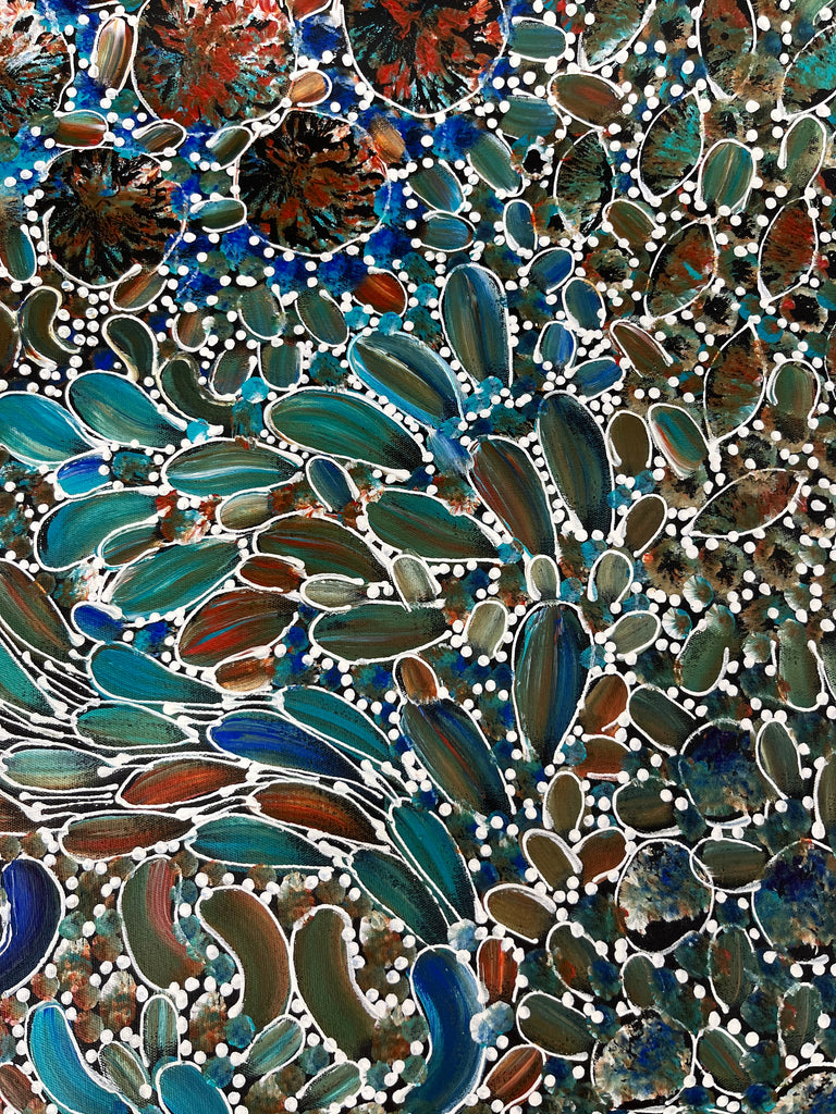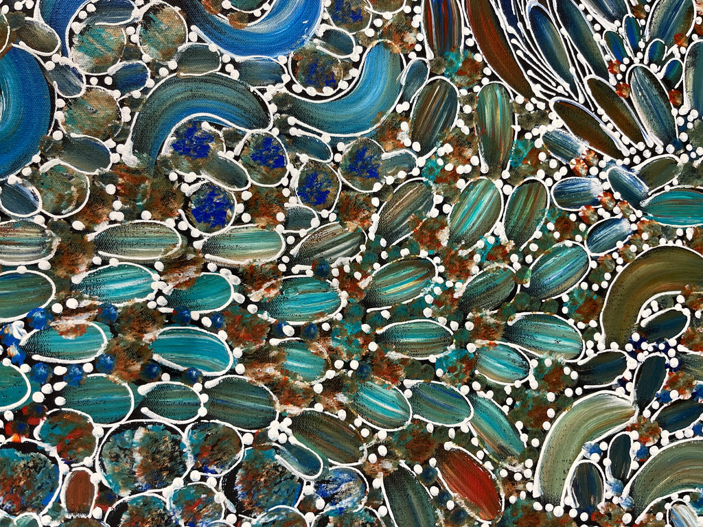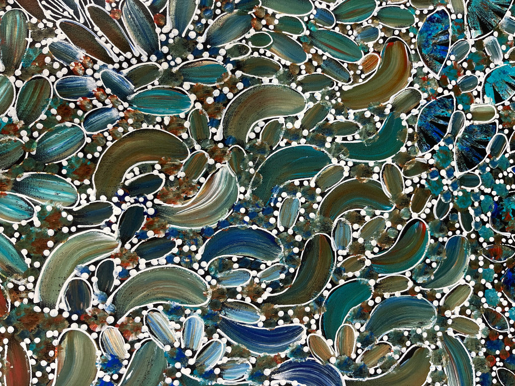 Her colourful and intricate paintings of Bush Tucker show some of the different types of traditional foods that the Women would collect including, seeds, berries, witchetty grubs, goannas as well as leaves that would be used for Bush Medicine.