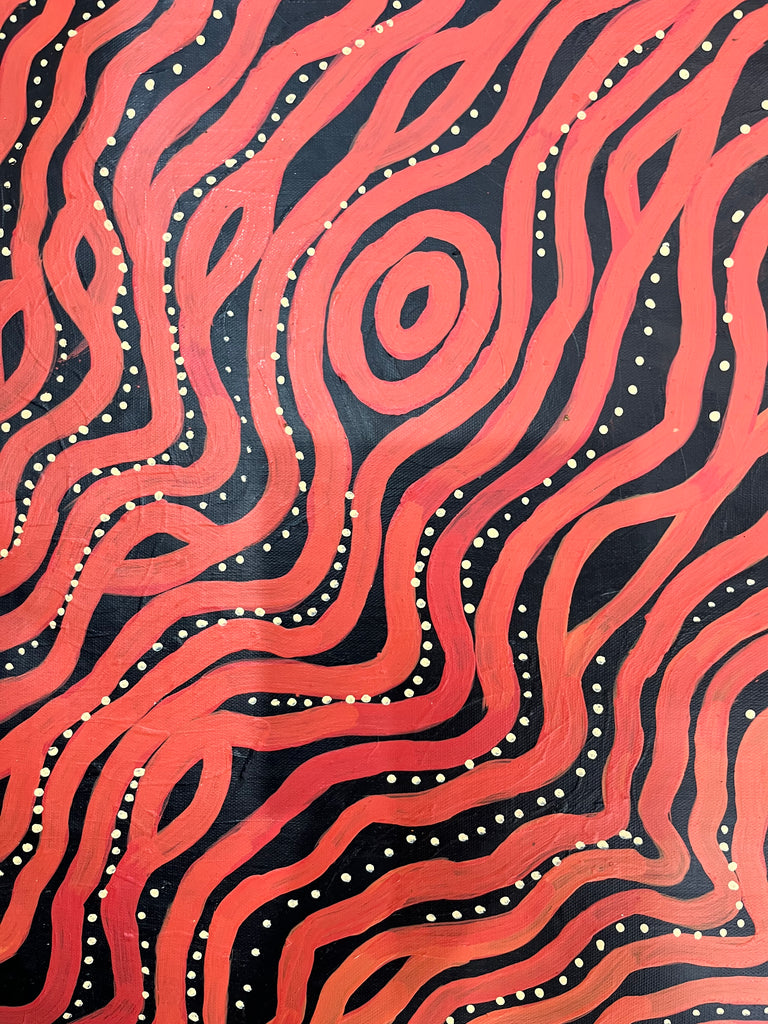 Sylvana is a talented emerging artist, she says her paintings are an act of remembering. Making these works takes her back to when she was a child growing up in the bush and watching and learning from her foster mum, who respected senior artists Ikuntji Arts in Haasts Bluff. Sylvana started painting at Umoona Arts in 2022 and works alongside her father in law Keith Minunga and their extended family.