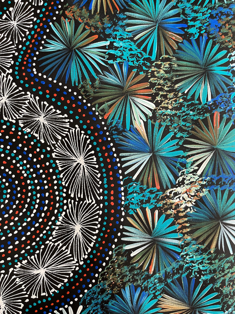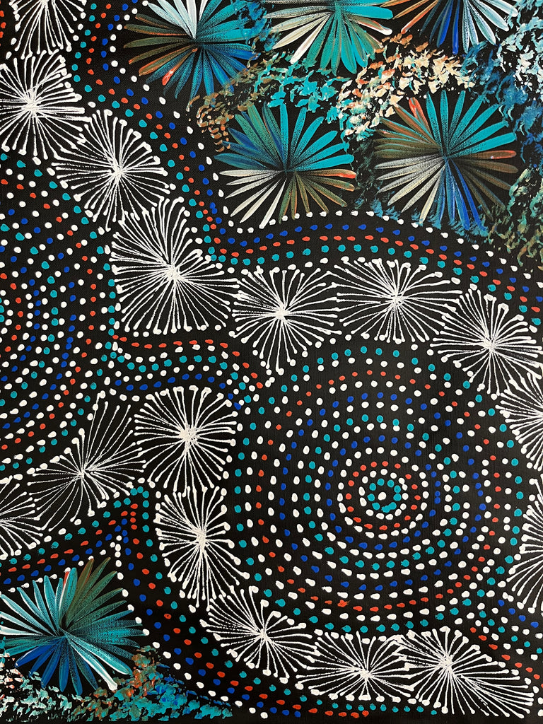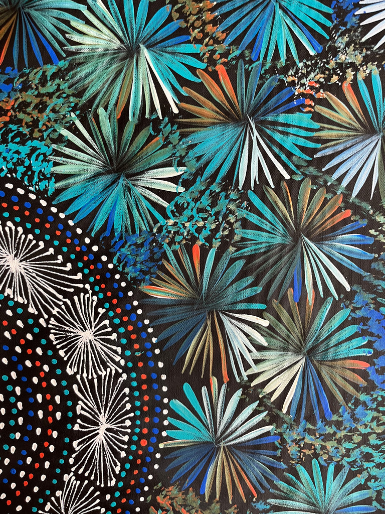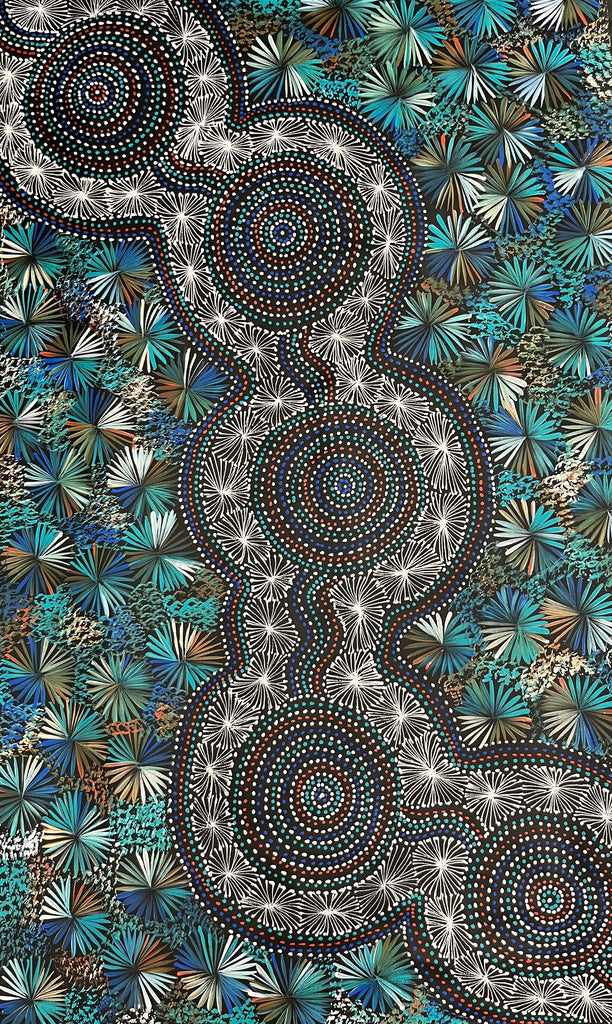 #323 Bush Leaves & Waterholes (Kookaburra)- SELINA NUMINA : Aboriginal Art 90cm x 147cm