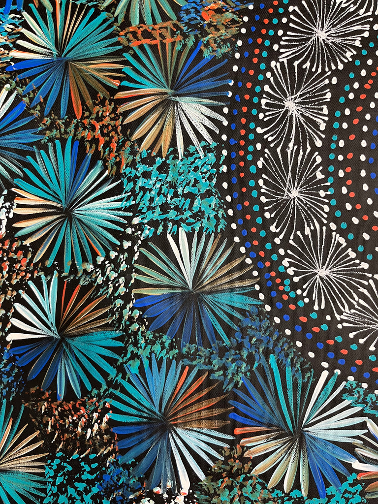 The Numina Sisters' bright and colourful bush medicine leaf paintings depict the different combinations of leaves used and how the leaves look different throughout the seasons or how they have fallen like a forest floor or been gather up or in close focus. Or how the seeds have fallen and separated from the leaves. The brushstrokes flow with the leaf shape pattern or the soft wind blowing them across the bare red dirt. The Numina Sisters all have a unique expression within the overall Bush Medicine Leaves style. Bush Medicine Leaves vivid sometimes flamboyant, sometimes subtle, sometimes even intense contemporary play of the palette gives uplift to the onlooker and the room.