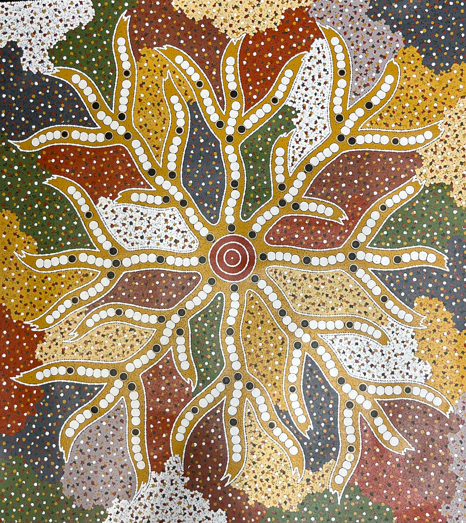The colours dotted in the background represent different parts of the bush-fire, white being for grass, yellow for ash, pink embers, red flame, black charcoal, green for the first growth of new grasses after the fire, grey smoke and the dark yellow colour is the dung of the wtichetty grub. The circle areas with the star-like design is the Spinifex grass.