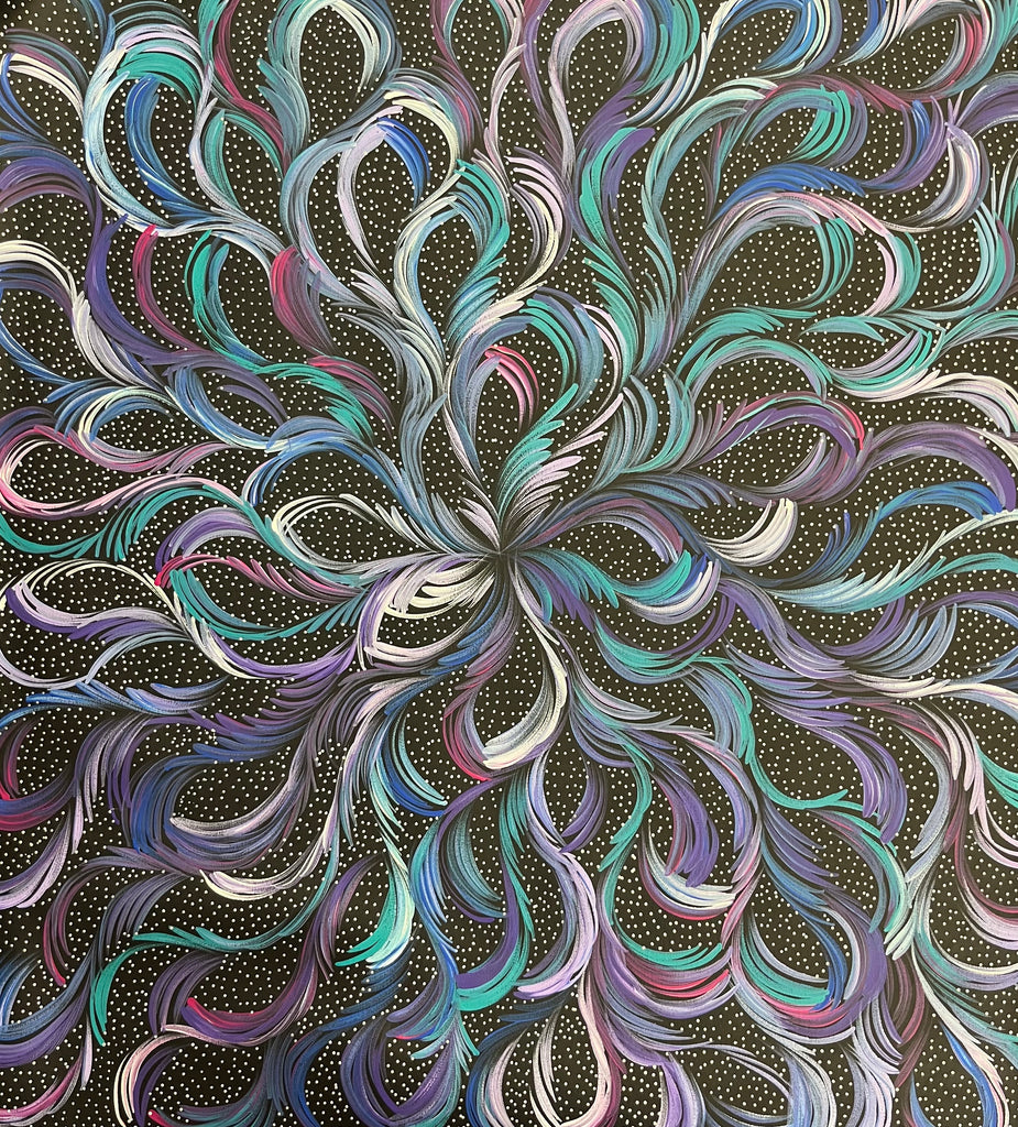 Medicine Leaves, Seeded Bush Yam, Bush Leaves, Kurrajong Seeding and Seeds Dreaming are a variant on the Bush Medicine Leaves theme of the Numina Sisters' stunning and flamboyant paintings series.